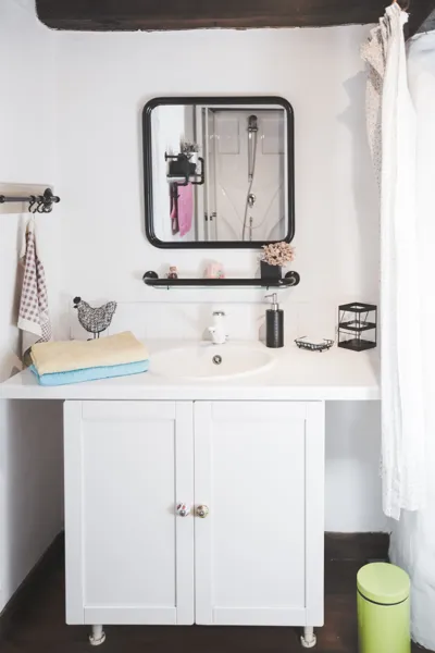 La deuxième chambre, aménagée sous les combles à l’étage, comprend : trois lits de 90, une armoire, une commode, une table/bureau, des tables de chevet, ainsi qu’une salle d’eau (lavabo et wc).