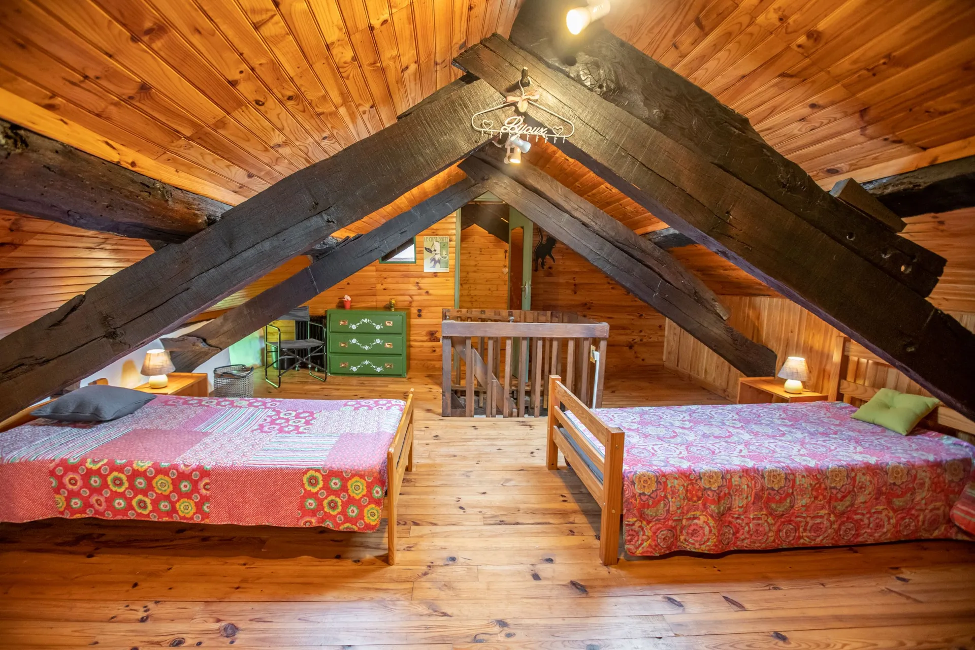 La deuxième chambre, aménagée sous les combles à l’étage, comprend : trois lits de 90, une armoire, une commode, une table/bureau, des tables de chevet, ainsi qu’une salle d’eau (lavabo et wc).